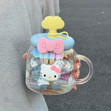 Cốc thủy tinh HelloKitty cô gái giá trị cao 2025 mẫu mới dung tích lớn có tay cầm ống hút tấn cốc bụng to