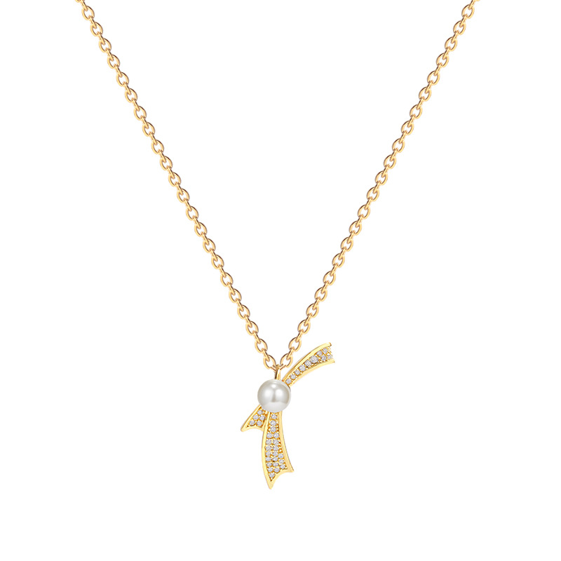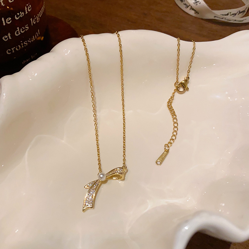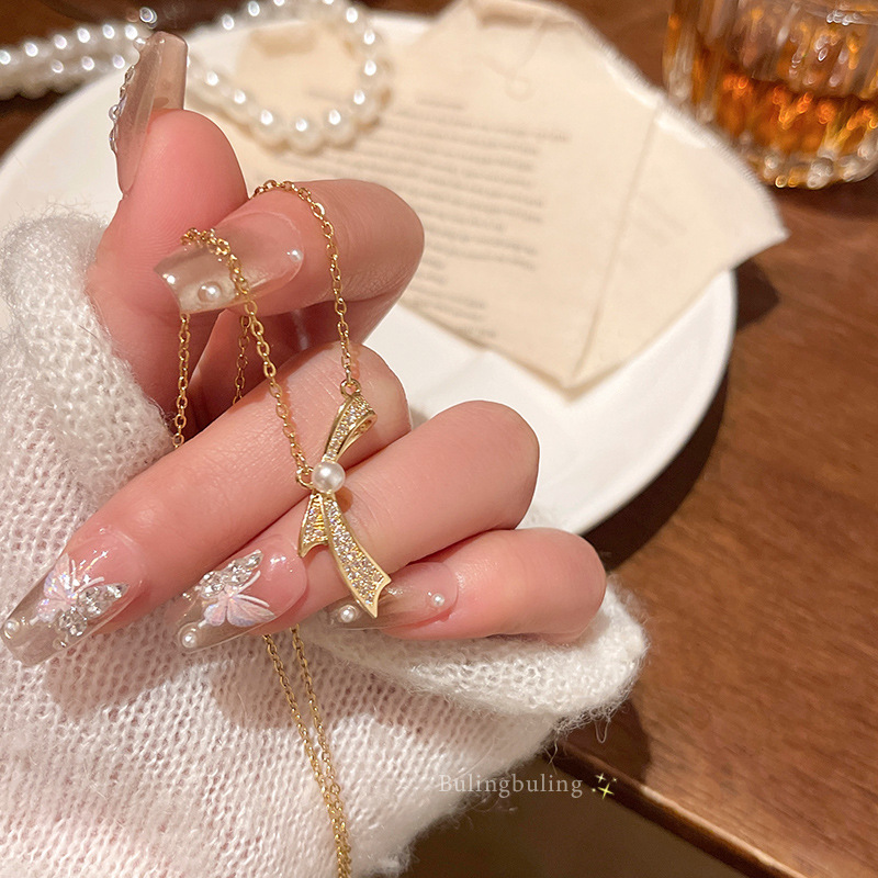 东大门新款独特设计感蝴蝶结钛钢项链女小众百搭气质珍珠锁骨链