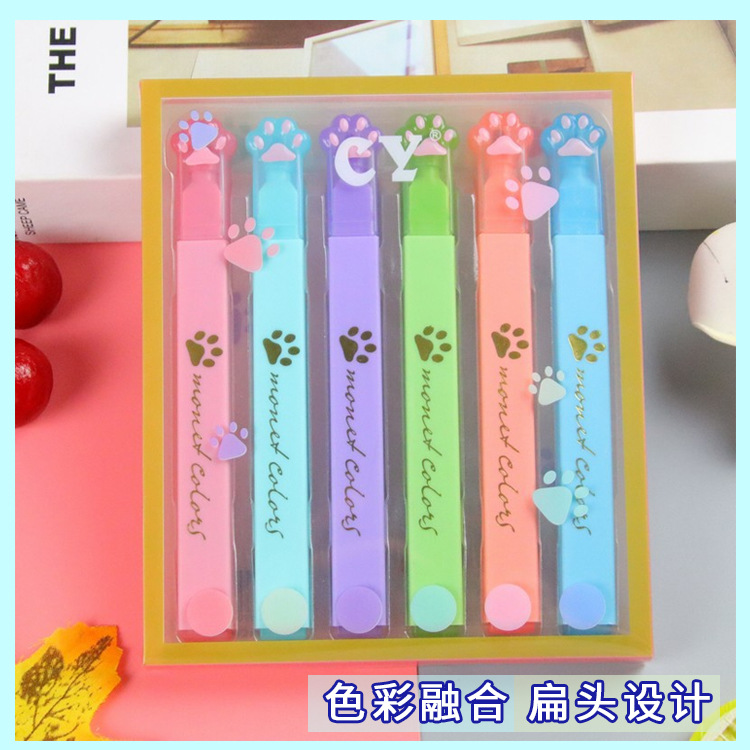 Bút đánh dấu bàn chải hoạt hình Mèo đóng hộp đầu xiên bảo vệ mắt học sinh Bút đánh dấu ghi bàn màu nhạt Bút Đánh Dấu