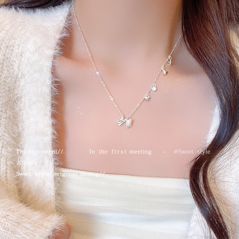 在逃公主银色蝴蝶结项链女小众高级感甜美气质桃心锁骨链颈链批发