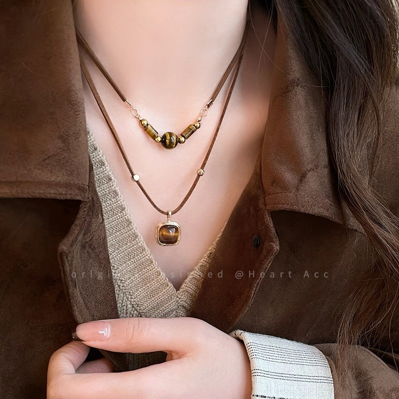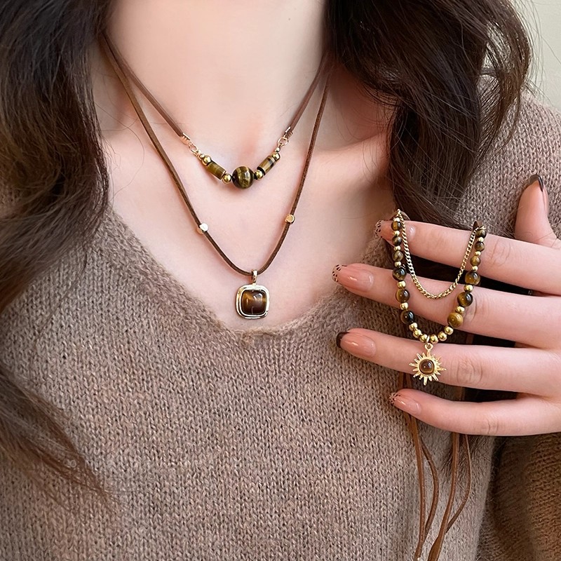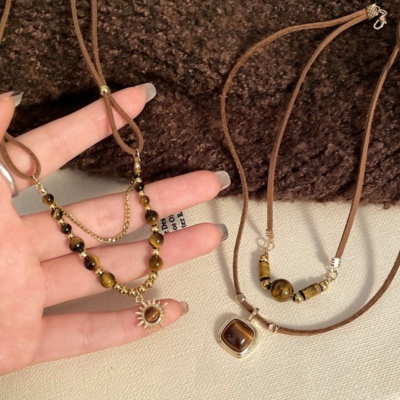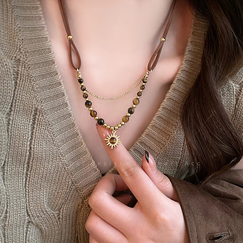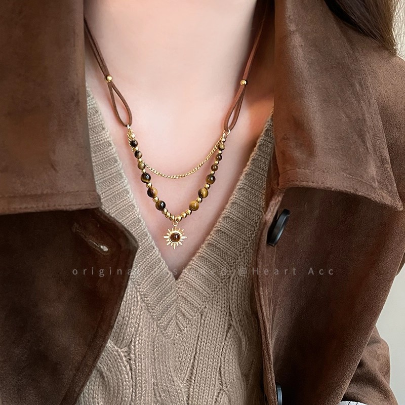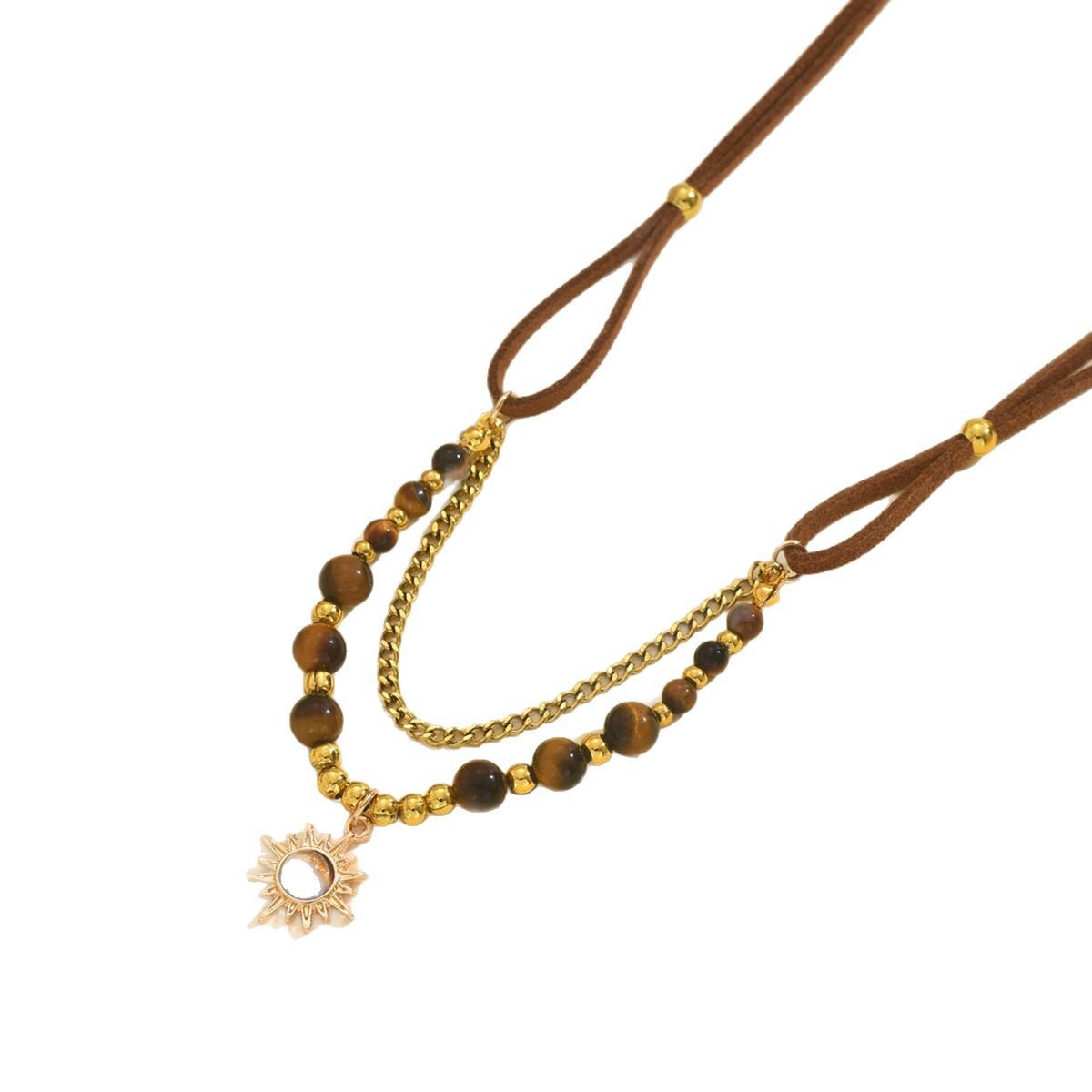 秋冬款美拉德咖色虎眼石项链女长款流苏太阳花毛衣卫衣链网红颈链