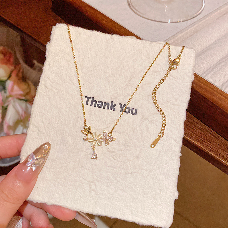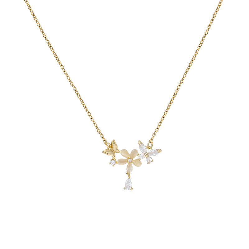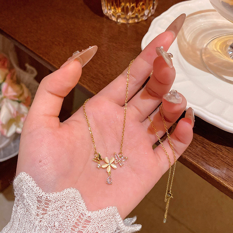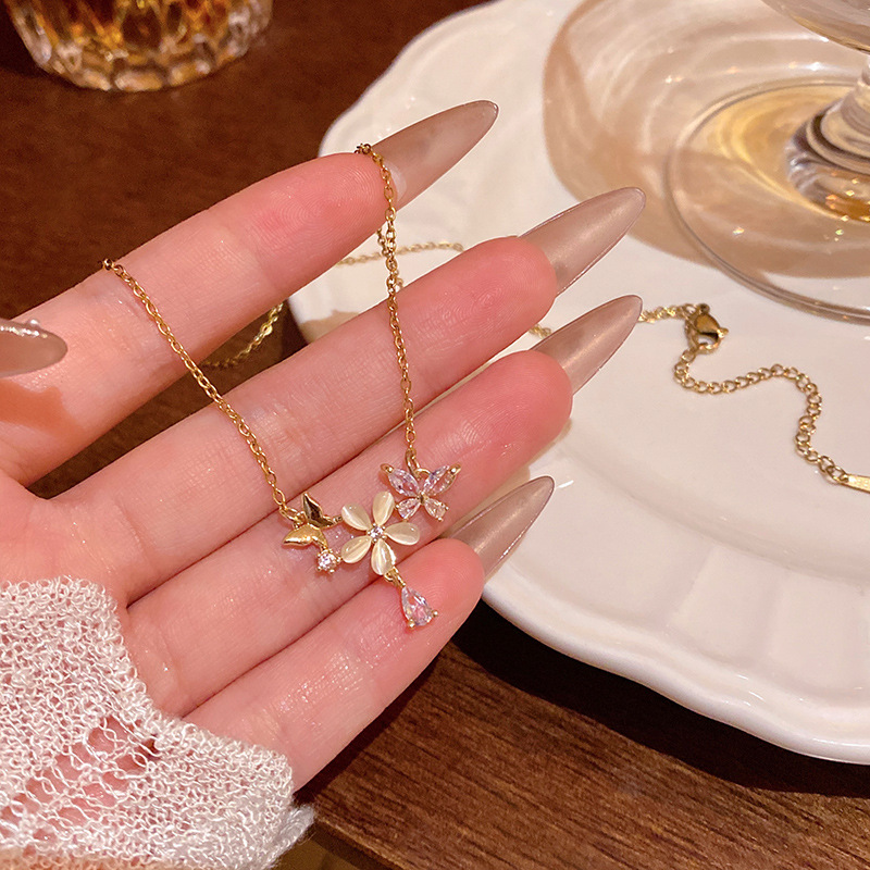 轻奢小众高级感猫眼石花朵吊坠项链女精致锆石钛钢锁骨链网红颈链