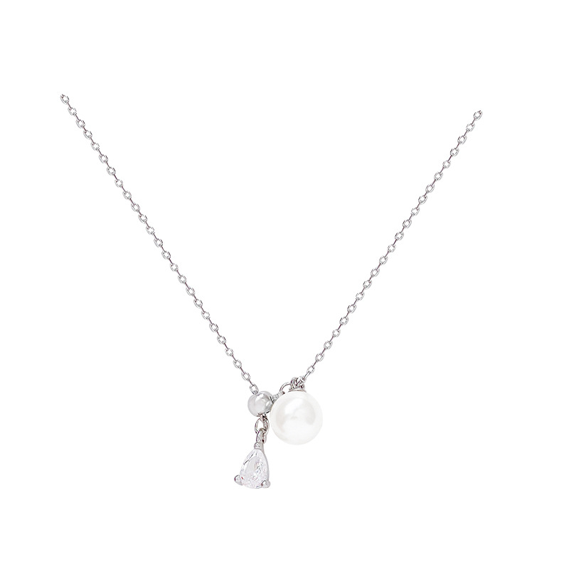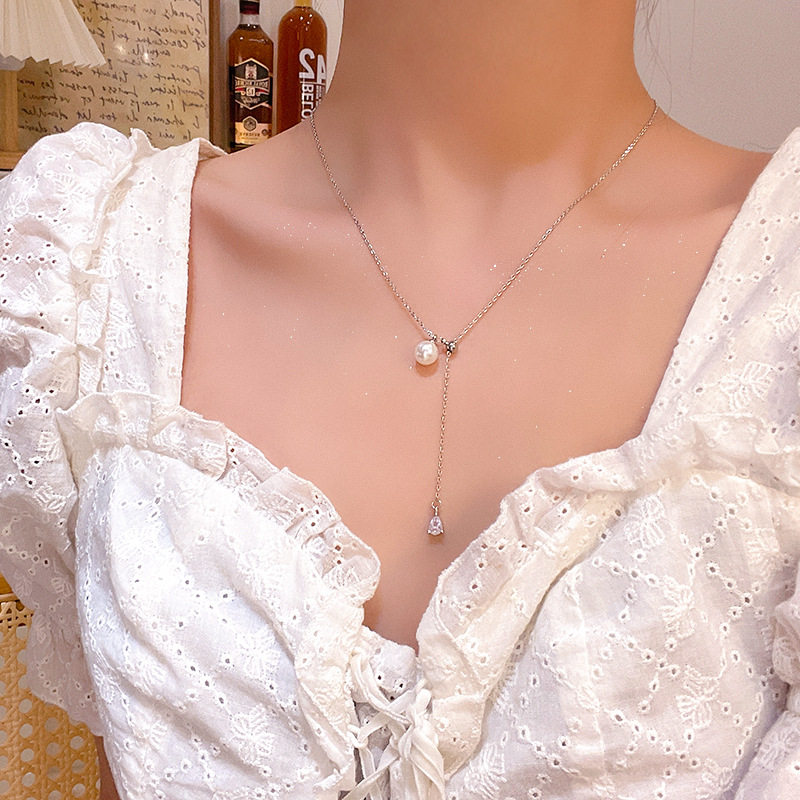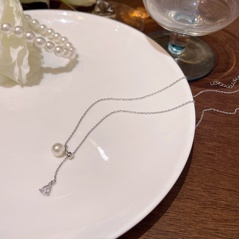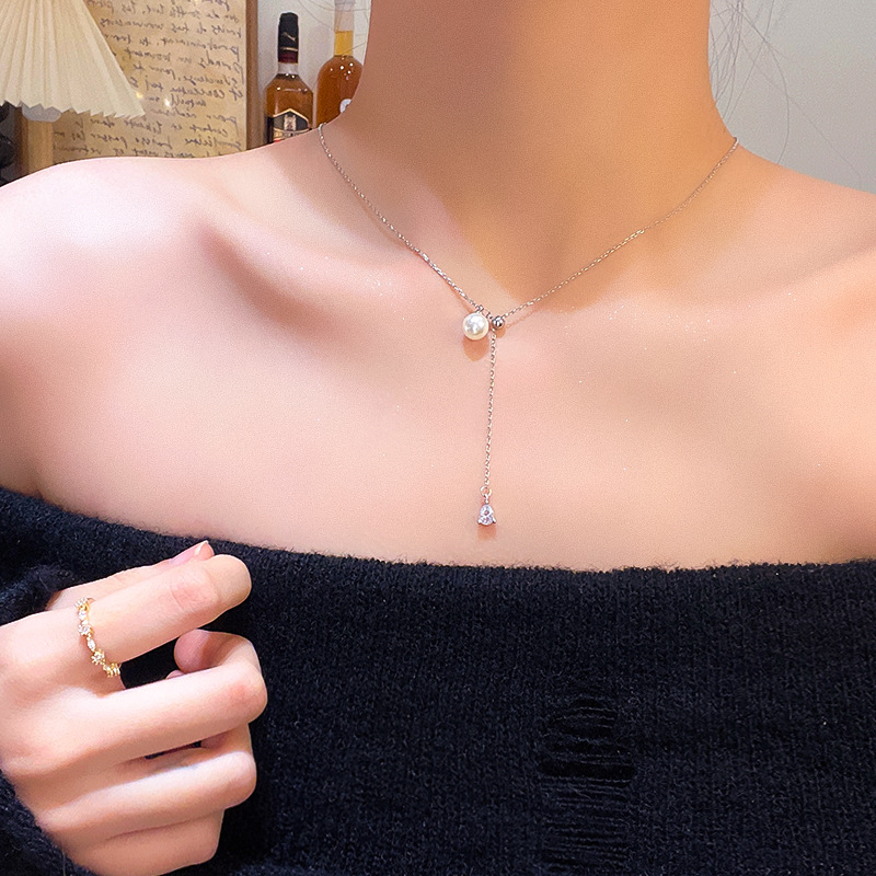 韩国新款简约水滴形锆石项链女高级感抽拉式钛钢珍珠锁骨链颈链