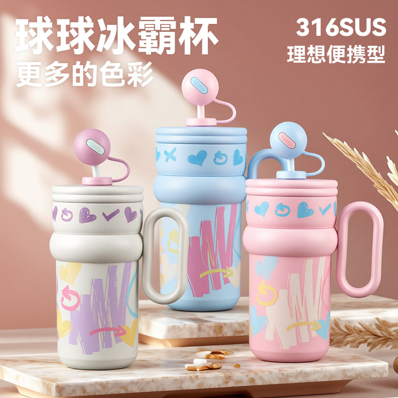Cốc giữ nhiệt graffiti cốc cà phê dung tích lớn cho nữ Cốc có tay cầm có giá trị cao mẫu mới 2024 cốc nước ống hút học sinh