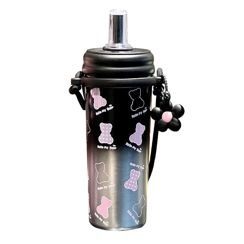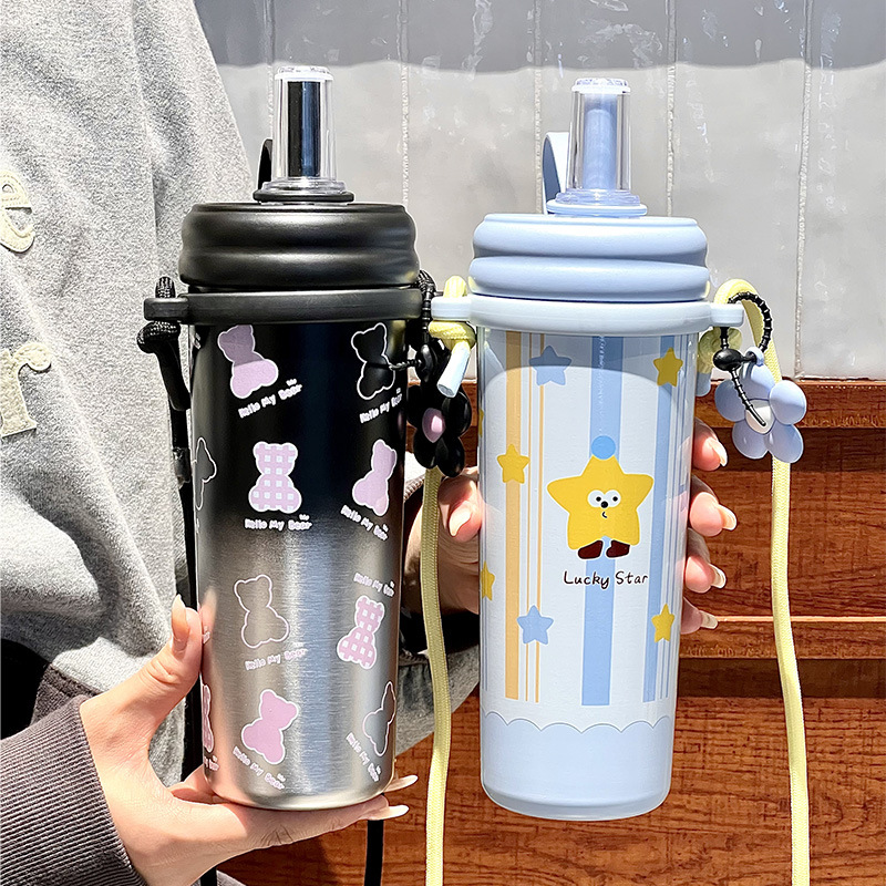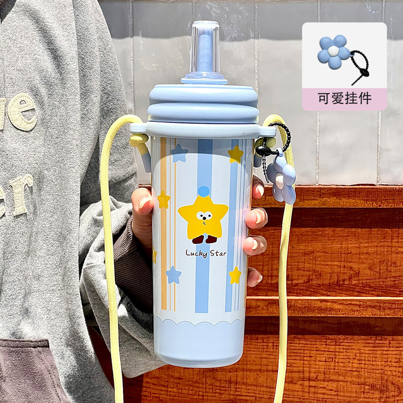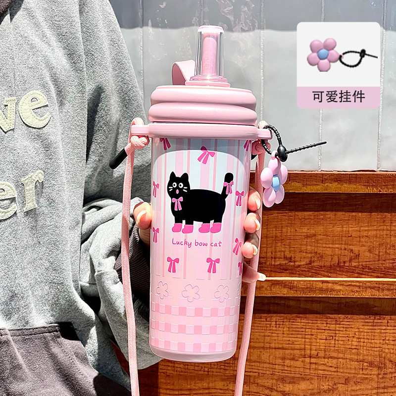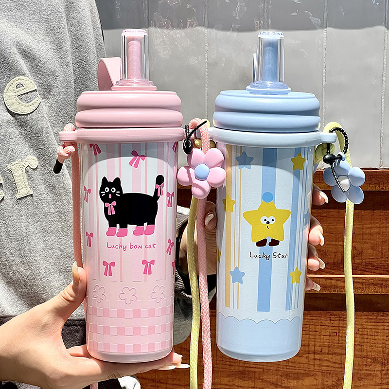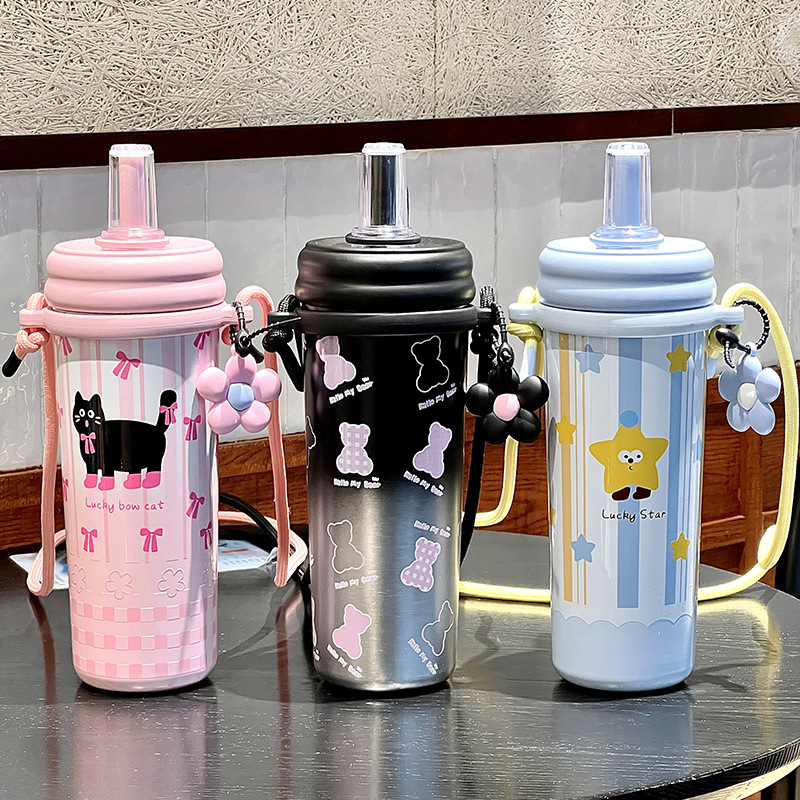 Cốc giữ nhiệt ống hút, cốc nước dung tích lớn có dây đeo 2024 kiểu mới có giá trị cao cho bé gái, Cốc trẻ em dễ thương