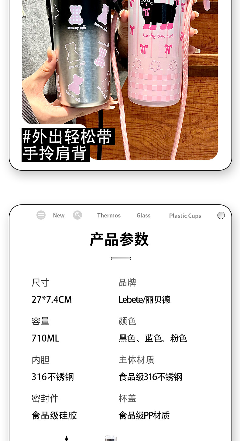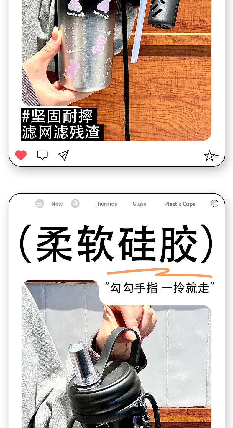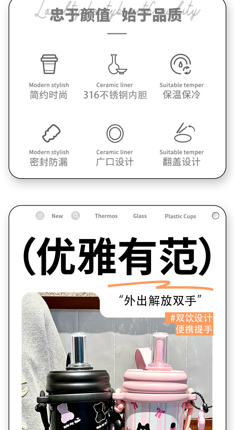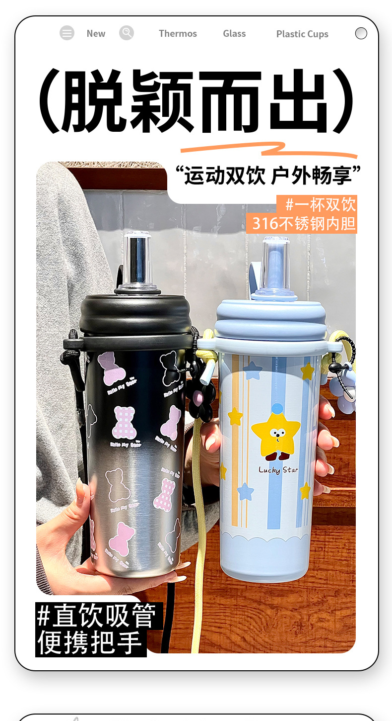 Cốc giữ nhiệt ống hút, cốc nước dung tích lớn có dây đeo 2024 kiểu mới có giá trị cao cho bé gái, Cốc trẻ em dễ thương