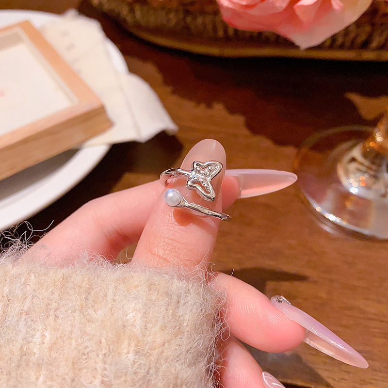 Hàn Quốc thích hợp cao cấp cảm giác đơn giản rỗng Nhẫn Bướm Nữ mở có thể điều chỉnh ăn kiêng ngón tay Mạng Nhẫn ngọc trai màu đỏ