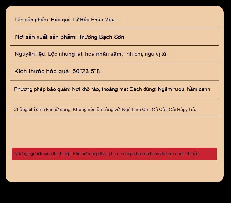 Nguyên liệu chính: Nhân Sâm Nhung Hươu Linh Chi Schisandra