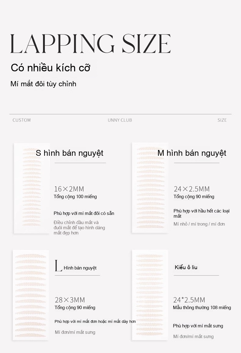 Mô hình S [100 bài đăng] ,M [90 bài] ,Loại ô liu [108 Bài] ,Ô liu cắt chéo [90 miếng dán] ,Mô hình L [90 bài viết] ,Loại tam giác cắt chéo mới (mắt đôi bên trong/sưng) ,Loại tinh chỉnh cắt đôi mới (loại mắt điều chỉnh đôi bên trong nhỏ) ,Kiểu cong xiên mới (mắt một mí/Đuôi Thấp) ,Gói hỗn hợp [142 miếng dán] (hình chữ S, hình chữ M, hình Ô liu) ,M [CuộN] ,Loại ô liu [CuộN] ,Loại rất mịn [CuộN] |
