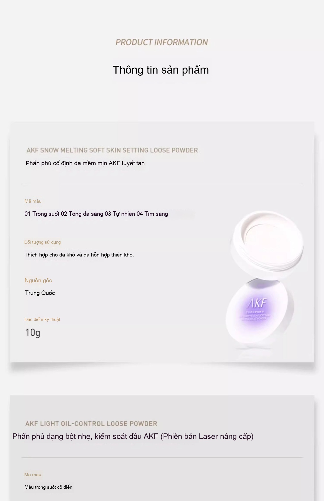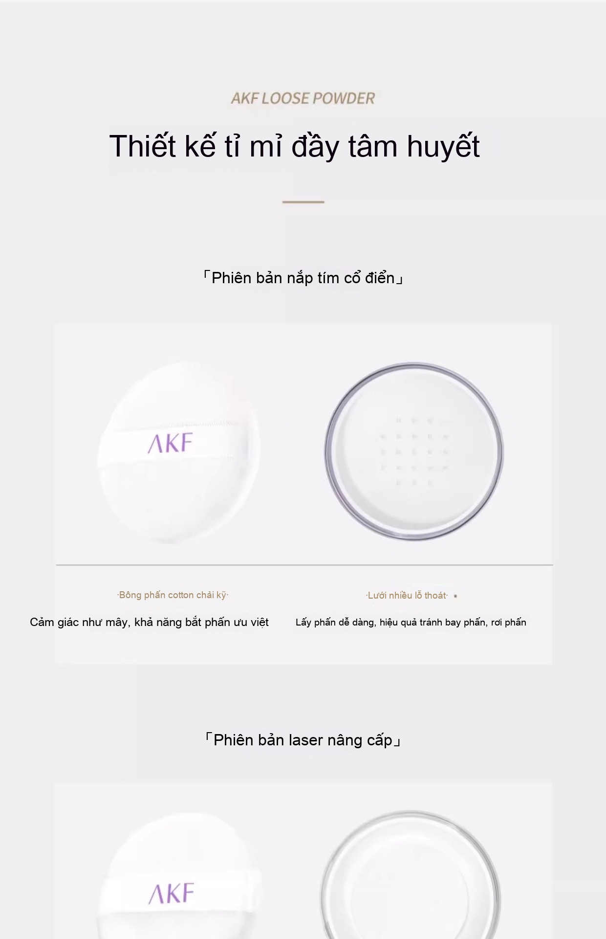 Màu tím kiểu cổ điển ,Nâng cấp Laser ,Bàn chải bột mịn AKF nâng cấp Laser ,#01 Mẫu trong suốt sương mù Nhẹ ,#01 Bộ cọ bột mịn AKF trong suốt sương mù Nhẹ ,#02 Mô hình trong suốt nhấp nháy mịn ,#02 Bàn chải bột mịn AKF trong suốt ,#03 Màu Da Nude trong suốt ,#04 Màu sắc tự nhiên mềm mại ,#03 Jing trong suốt màu da nude AKF phấn phủ ,#04 Màu sắc tự nhiên mềm mại AKF ,Xuerong mẫu 01 # Màu trong suốt ,Xuerong kiểu 02 # màu da sáng ,Xuerong mẫu 03 # Màu tự nhiên ,Xuerong mô hình 04 # Bang sáng tím |