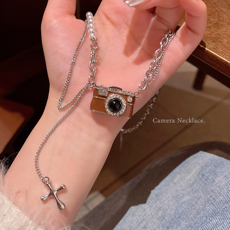Retro Màu cà phê ngộ nghĩnh máy ảnh Mặt Dây Chuyền Vòng cổ nữ dài tua rua chéo Mặt dây chuyền Áo len dây chuyền xương đòn Vòng cổ